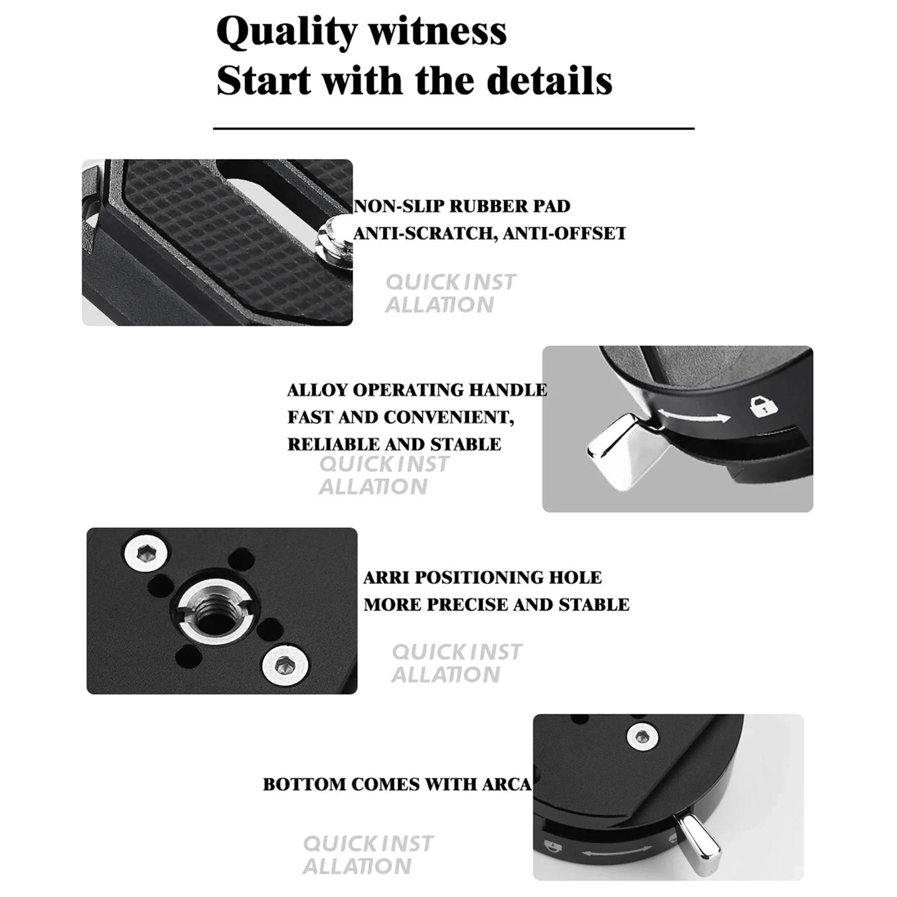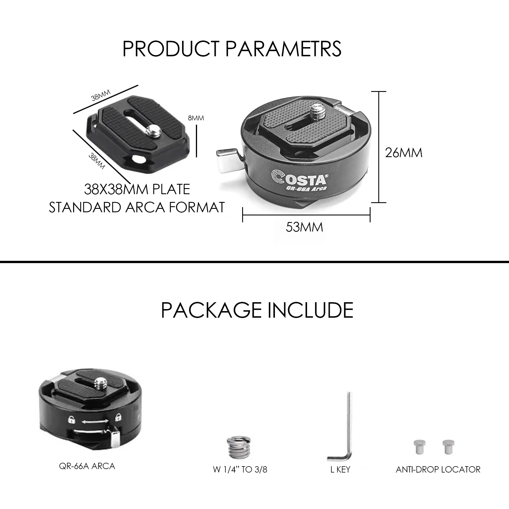 Both the quick-release plate and the base are designed to fit the Arca Swiss 38mm slot, ensuring that this system can be widely used in conjunction with a variety of tripod plates and mounts on the market.