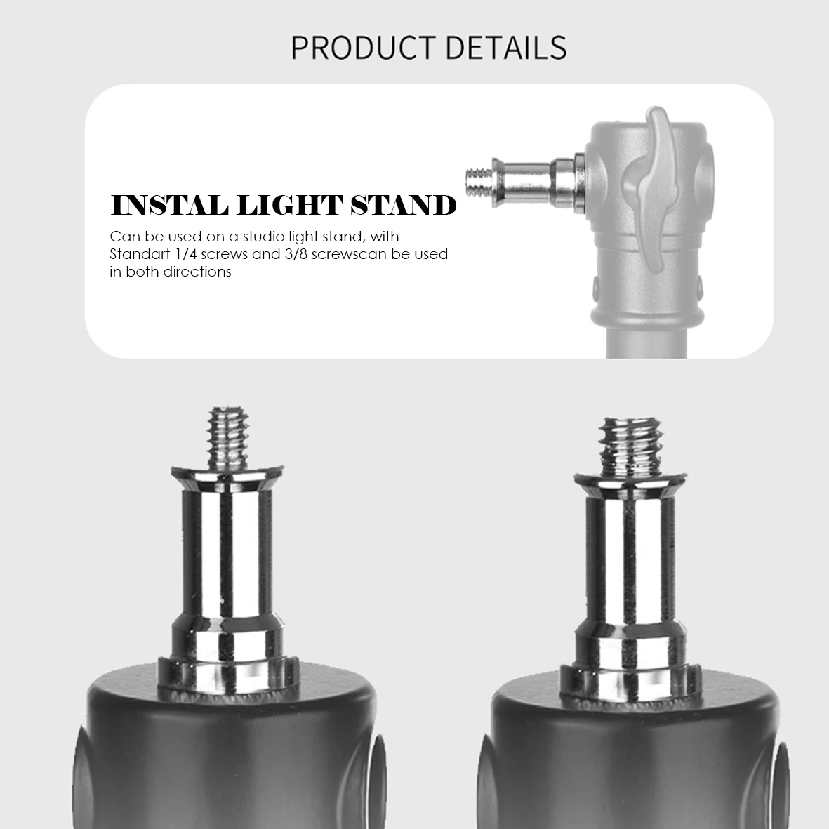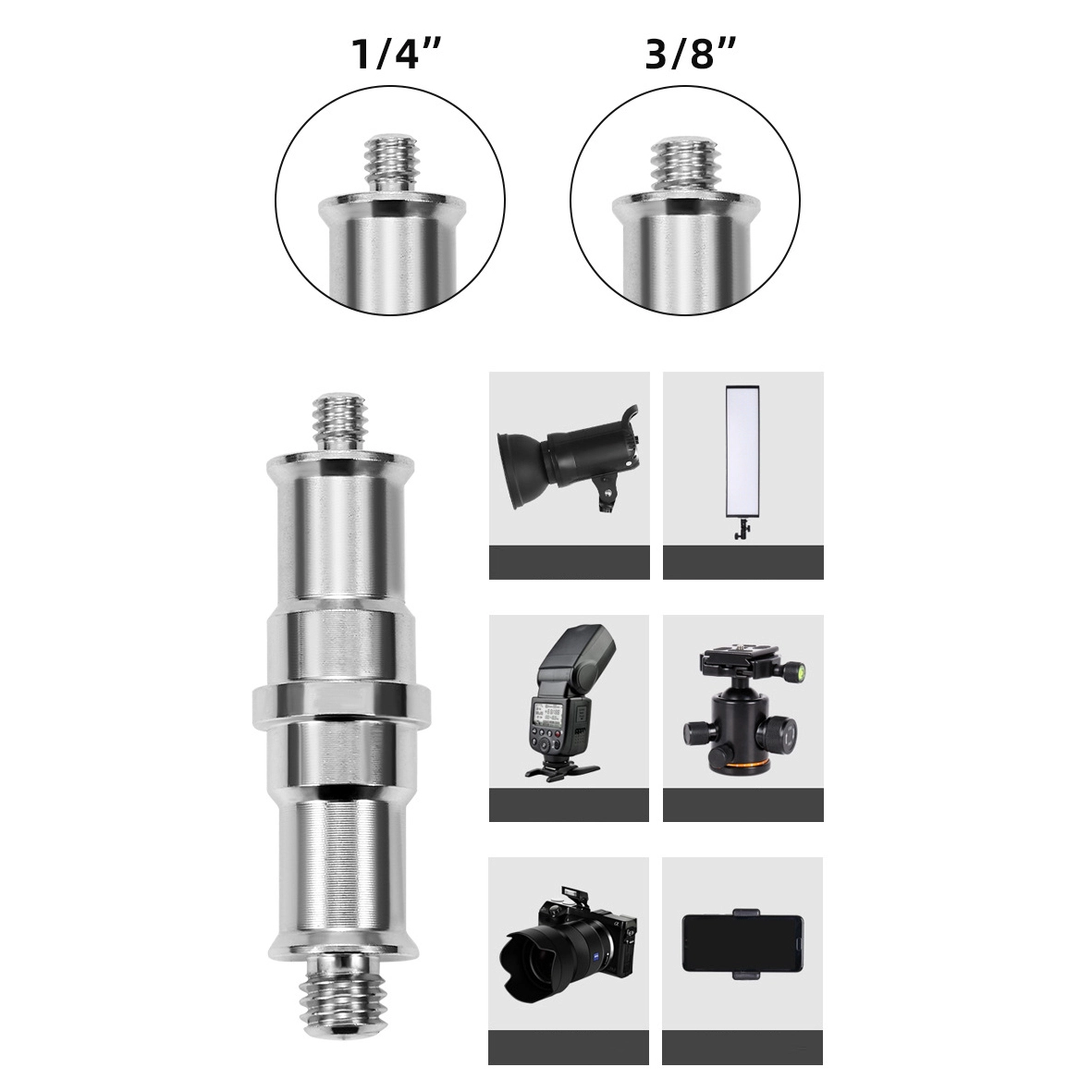 Dual Screw Threads This adapter is equipped with 1/4" and 3/8" threads, allowing you to connect a variety of photographic devices with different thread sizes, increasing flexibility and ease of use.