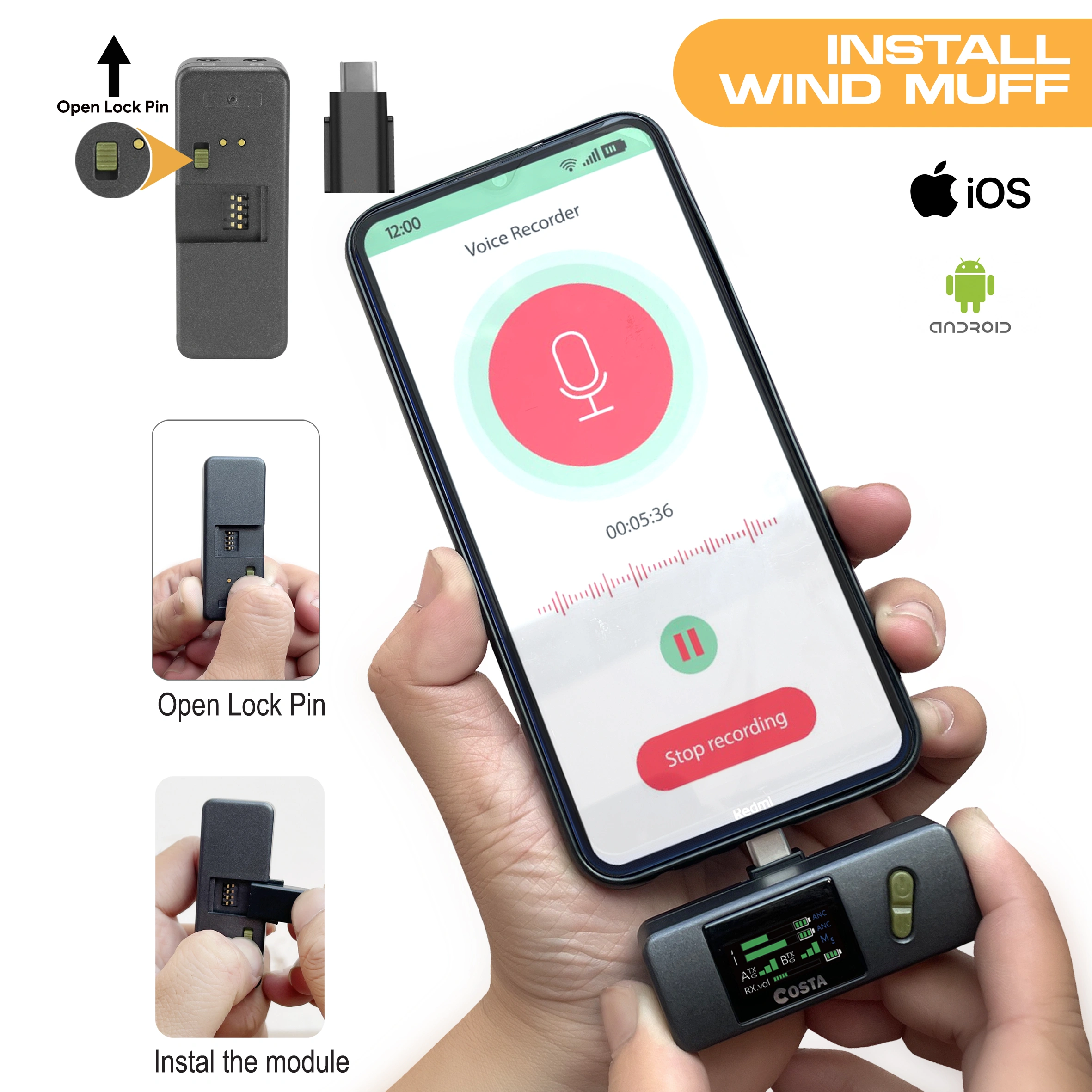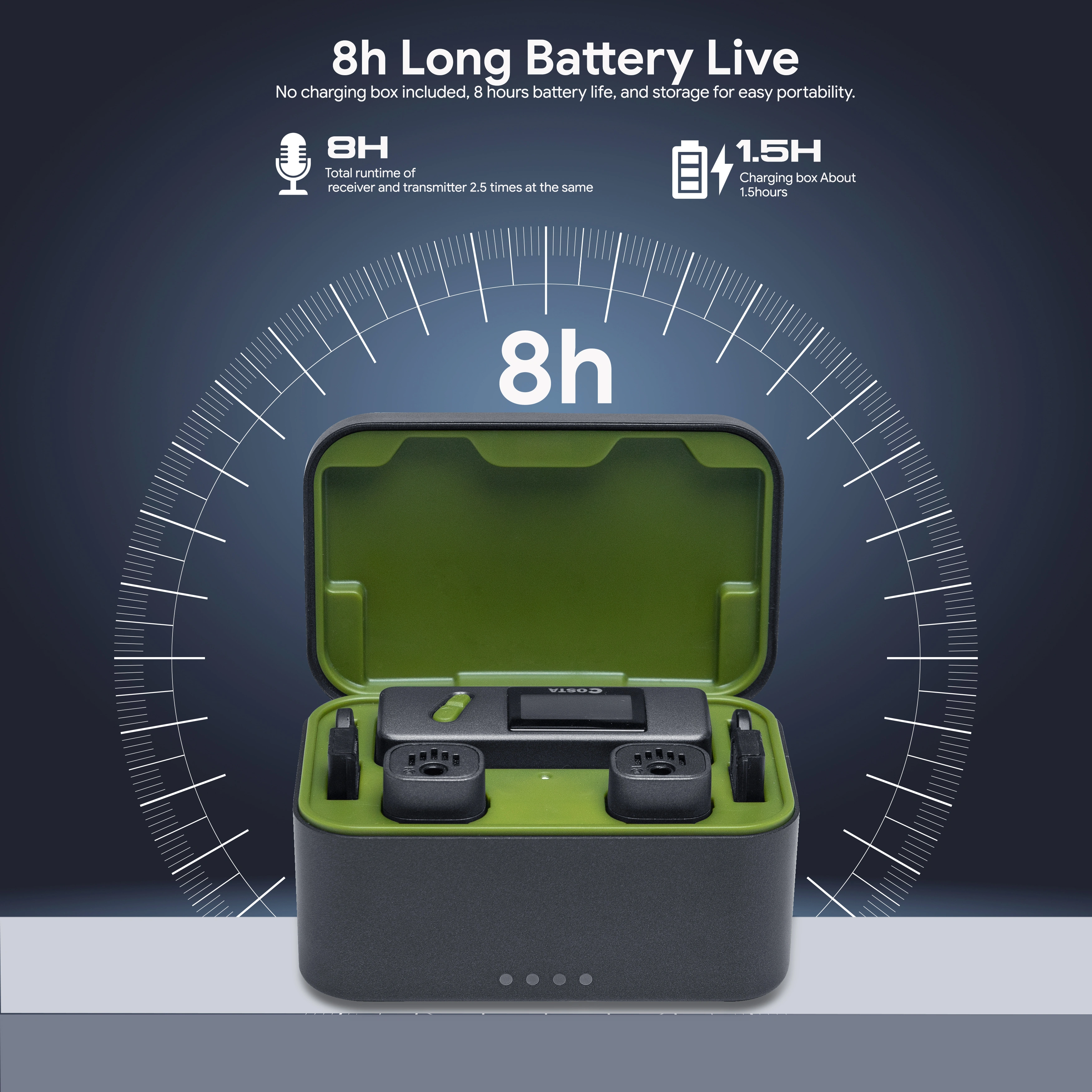 2-Person Interviews, Videos, Streaming Connects to Cameras, iOS/Android Devices, mixer, Laptop 2 x Clip-On Transmitter with Mic Compact Dual-Channel Receiver Noise ANC Stereo Mono Switch 5-Level Gain Adjustment (RX) 3-Level Volume Adjustment (TX) Support 3.5 External Clip On Mic Real Time Monitoring Intuitif Display Amoled 50m Range Charging Case, Built-In Batteries