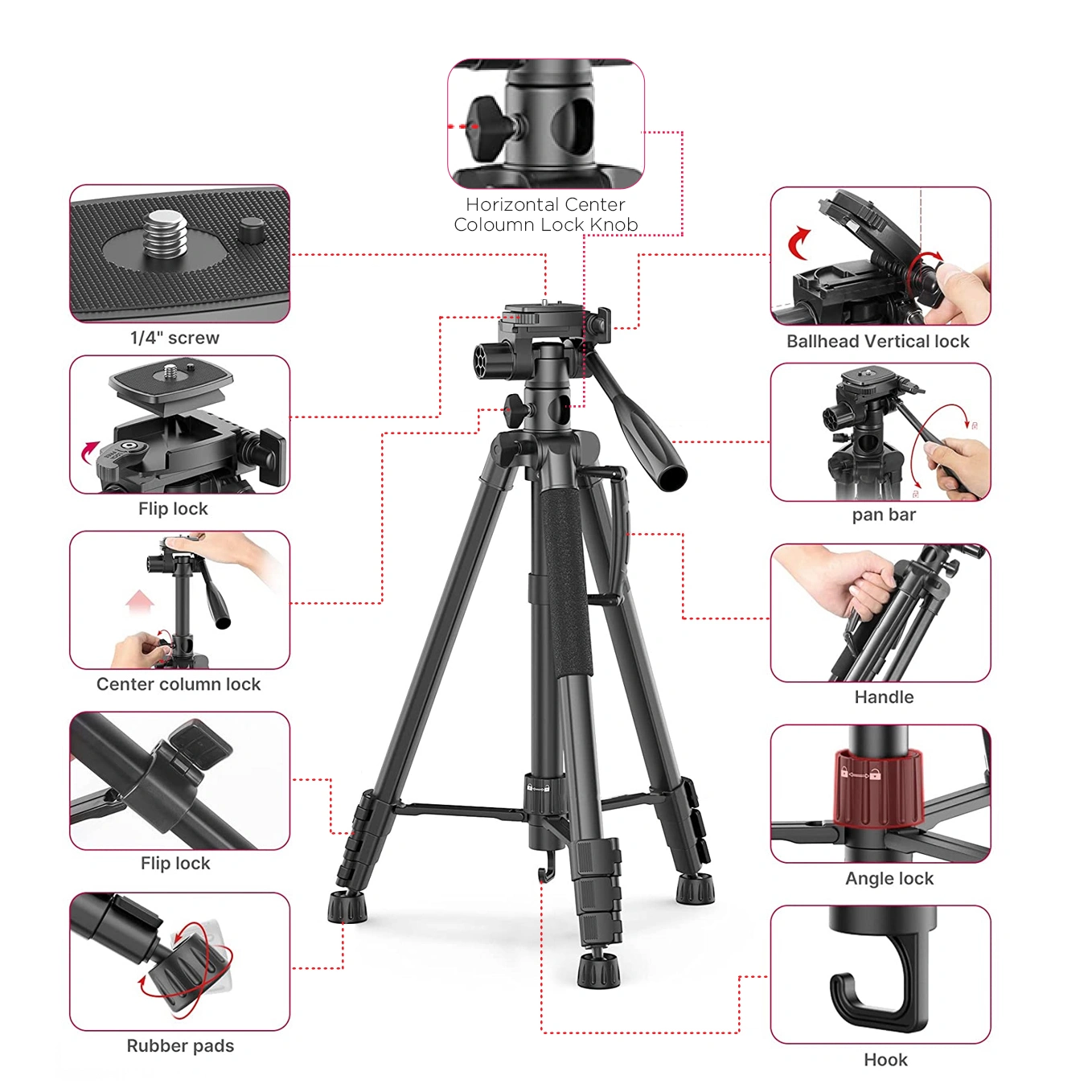 Allows for easy shooting from various angles, as well as quick and convenient height and angle adjustments with the flip-lock system. Equipped with anti-slip rubber on the ends of the legs, ensuring the tripod remains stable on various surfaces, keeping your equipment safe during shooting.